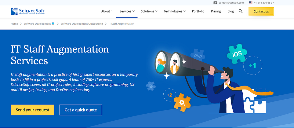 ScienceSoft is the leading provider of IT staff augmentation services. They offer access to a diverse pool of skilled IT professionals to enhance your team’s capabilities and help you establish an effective cooperation model. With ScienceSoft, you can improve efficiency and excellence in software development, cybersecurity, and more.